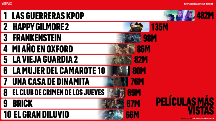 Este reporte mide el engagement por el tiempo de visualización (total de horas vistas dividido por el tiempo de reproducción) y recopila todas las visualizaciones de la segunda mitad de 2025, lo que representa 96 mil millones de horas vistas en Netflix.